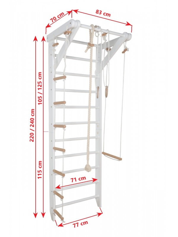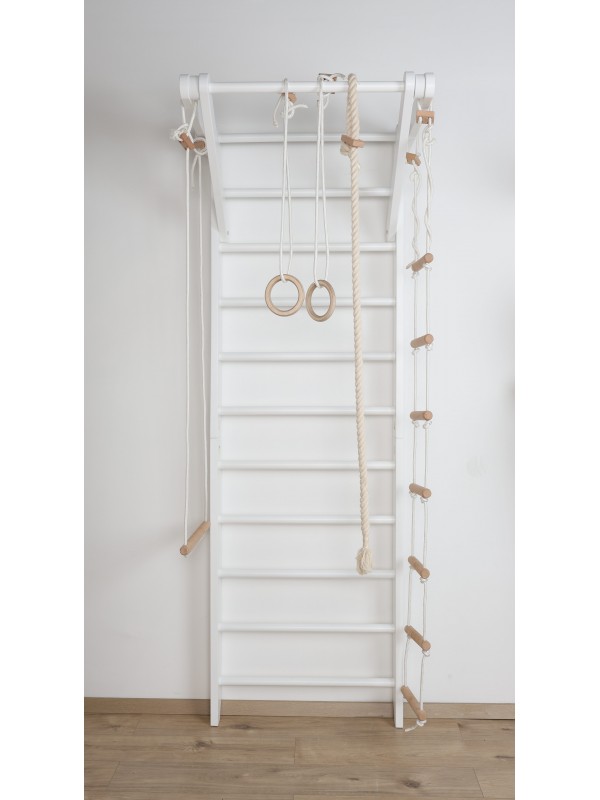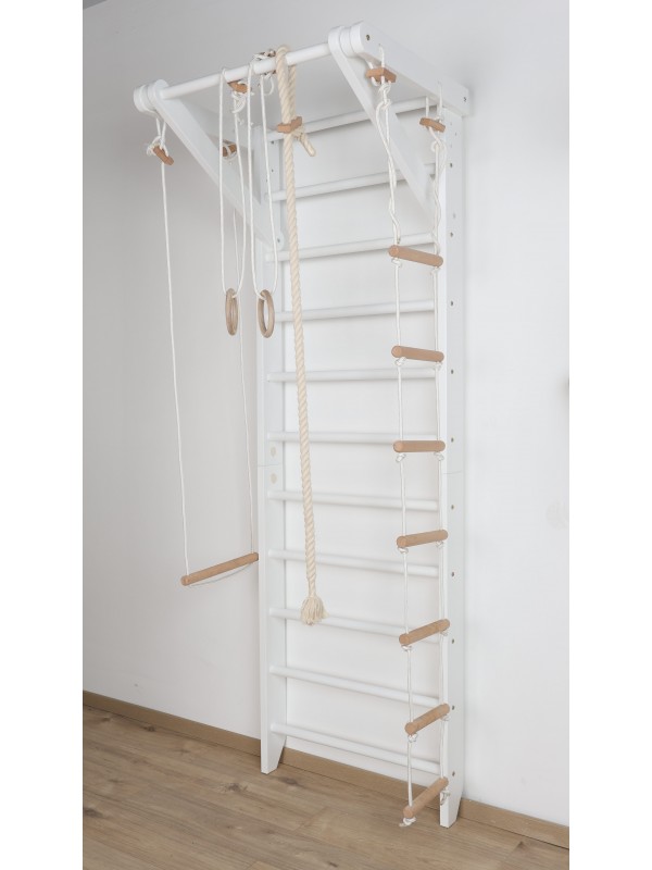 ¿Buscas un equipo deportivo multifuncional que entusiasme a los niños y permita a los adultos entrenar? Nuestra escalera de pared de madera blanca con accesorios es la solución perfecta para una vida activa en casa: segura, compacta y fabricada con materiales naturales de alta calidad. Su color blanco elegante se adapta a cualquier espacio, aportando frescura y limpieza.