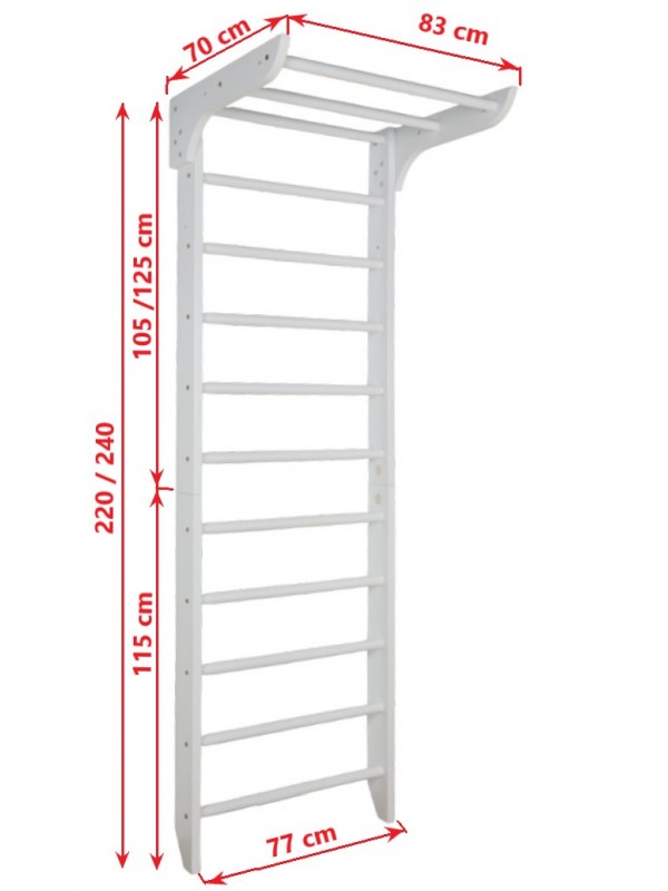 Escalera de pared blanca de madera de haya de alta calidad – el accesorio de entrenamiento perfecto para toda la familia. Diseñada para niños y adultos, es ideal para uso en interiores, fomentando la fuerza, el equilibrio y la coordinación de forma segura. Su color blanco elegante aporta un toque moderno y luminoso a cualquier espacio del hogar.