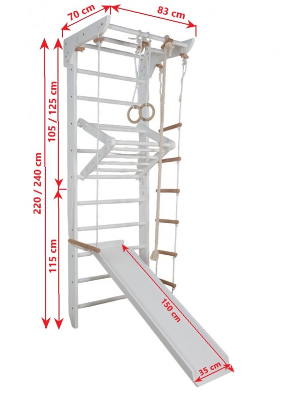 ¿Buscas un equipo de entrenamiento multifuncional que motive tanto a niños como a adultos? Nuestra espaldera blanca de madera con accesorios es la solución ideal: fabricada en Europa con madera de haya natural, segura, compacta y duradera, y pintada con un acabado blanco HIDROHEL seguro para niños. Diseñada para ofrecer ejercicio saludable y diversión en casa para todas las edades.