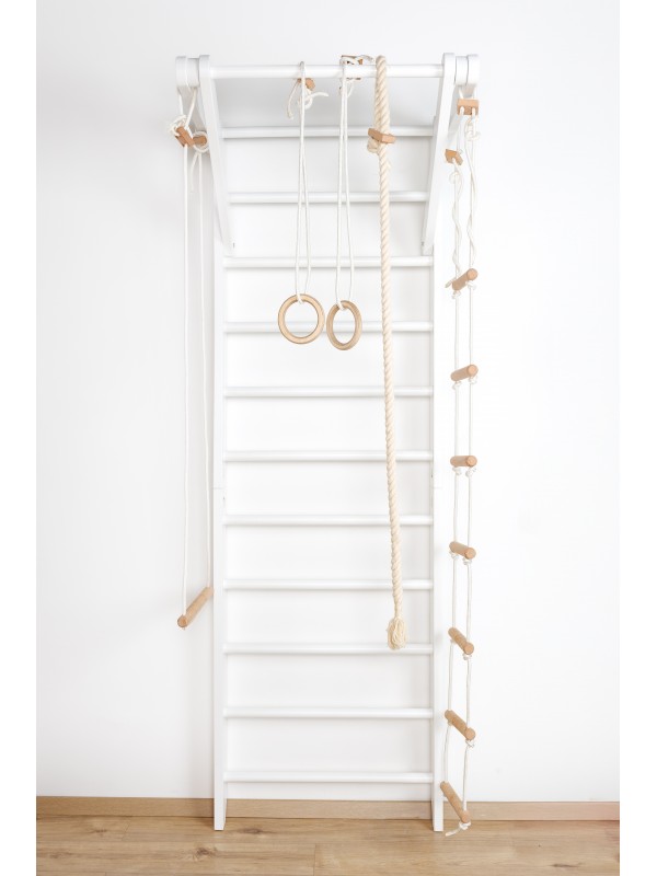 ¿Buscas un equipo deportivo multifuncional que entusiasme a los niños y permita a los adultos entrenar? Nuestra escalera de pared de madera blanca con accesorios es la solución perfecta para una vida activa en casa: segura, compacta y fabricada con materiales naturales de alta calidad. Su color blanco elegante se adapta a cualquier espacio, aportando frescura y limpieza.