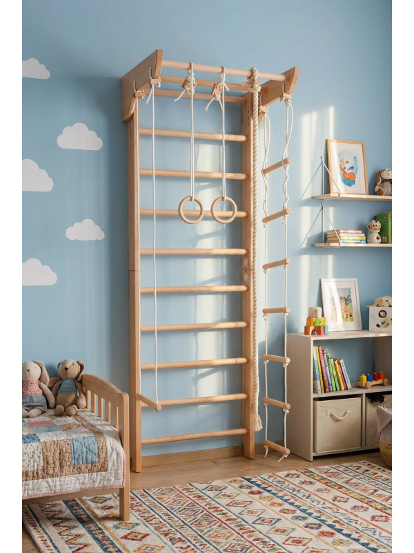 ¿Buscas un equipo deportivo multifuncional que divierta a los niños y, al mismo tiempo, permita entrenar a los adultos? Nuestra espaldera de madera con accesorios es la solución perfecta para una vida activa en casa: segura, compacta y fabricada con madera natural de haya de alta calidad.
