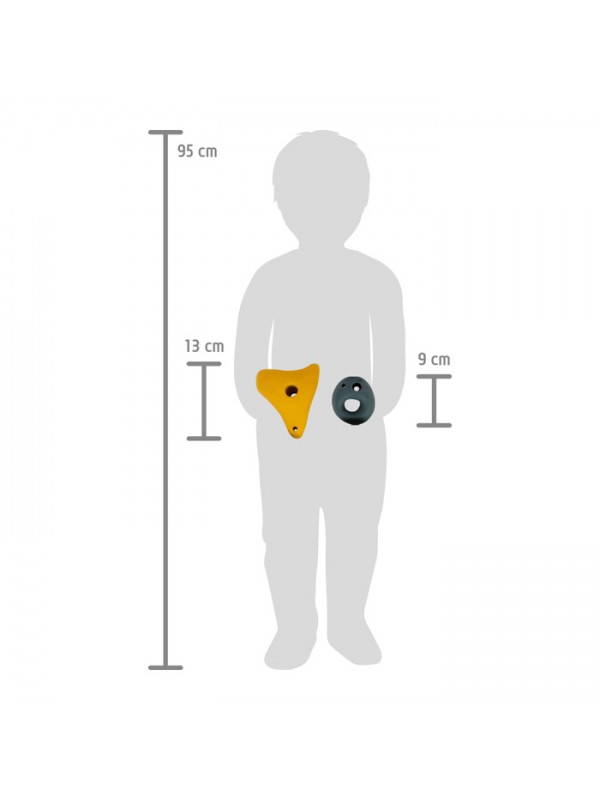 Fabricadas en material resistente y de diferentes formas, las piedras están diseñadas para no girar de manera inesperada gracias al sistema de montaje de dos puntos. Los niños pueden agarrarlas fácilmente gracias a su tamaño y superficie estructurada, permitiendo una escalada segura y divertida.